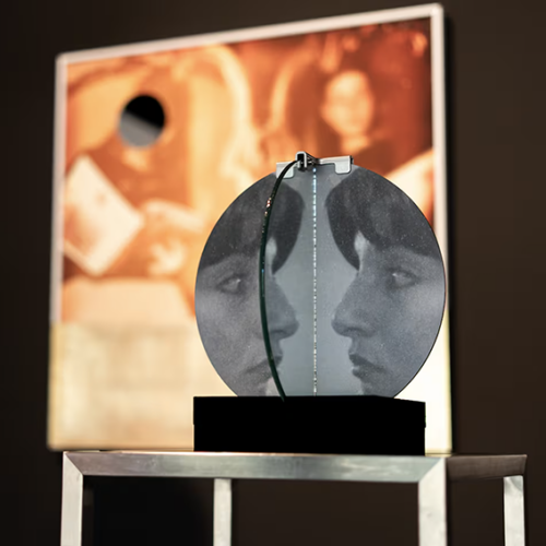 «La Mirada Triangular” by Pablo Murillo investigates the act of looking as a relational game between image, viewer, and space. Through mirrors, concealed faces, and pendular objects, the work activates a playful yet reflective experience, with Velázquez-like echoes. The device transforms memory and family archive into an unstable, almost spectral presence. The image looks back, questioning identity, absence, and certainty, and confronts us with the fragility of both the real and the remembered through a hybrid installation that dismantles traditional binaries and categories.